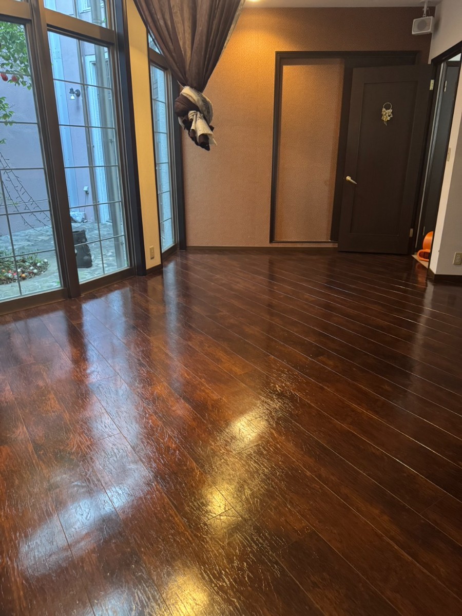 仕上がりはご覧のとおり、床全体に美しい光沢が戻り、清潔感と高級感のある空間に生まれ変わりました。お客様からも「明るくなった」「印象が良くなった」と喜んでいただけました。